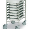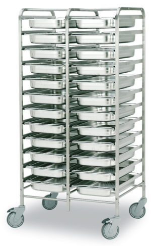 GNT-12-Wagen eignen sich für 12 GN1/1-Behälter, das Modell GNT-24 für 24 Behälter. Der Abstand zwischen den Führungsschienen beträgt 105 mm.